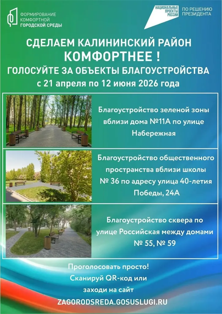 В рамках реализации федерального проекта «Формирование комфортной городской среды» в период с 21 апреля по 12 июня 2026 года проводится онлайн голосование граждан по выбору общественных территорий, подлежащих благоустройству в первоочередном порядке. Калининский район также принимает участие в выборе общественных территорий, подлежащих благоустройству в 2027 году.
